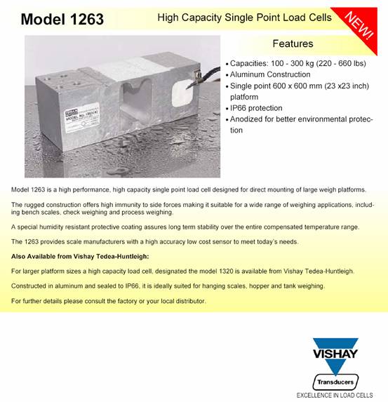 描述:1263是為大尺寸平臺(tái)秤設(shè)計(jì)的直接安裝的高性能高量程單點(diǎn)式傳感器。這個(gè)結(jié)構(gòu)保障了高的抗偏載能力,使得1263有廣泛的應(yīng)用領(lǐng)域,包括臺(tái)秤、分選秤、吊掛式電子秤和過(guò)程稱重。